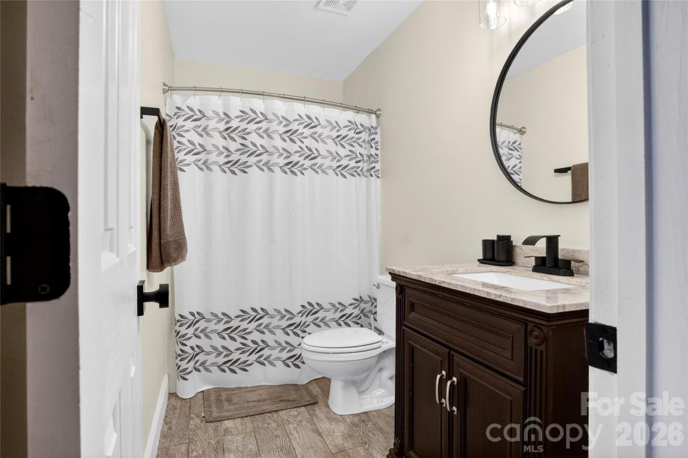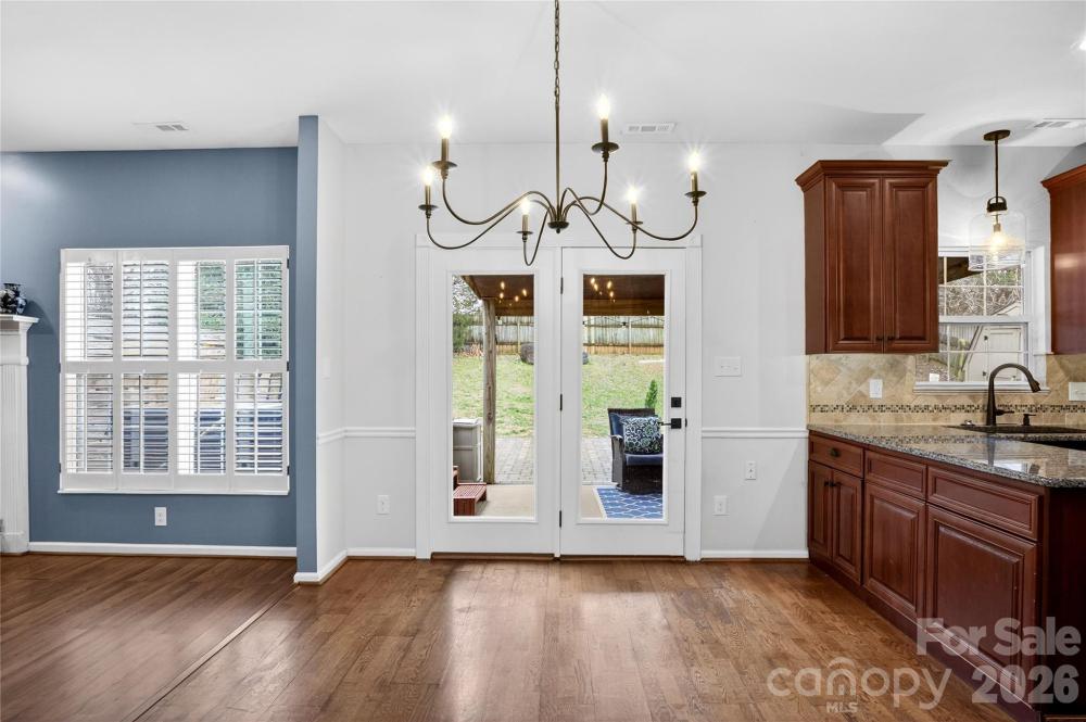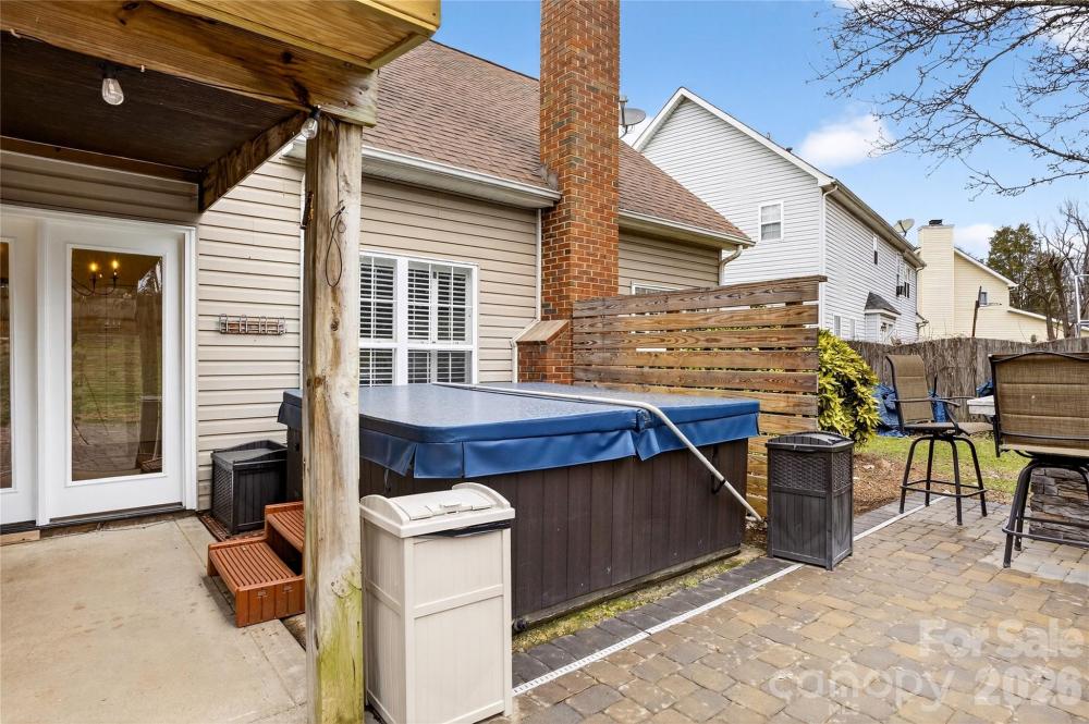 Nestled quietly between Waverly and Blakeney, this home offers convenient access to shopping, dining, and everyday amenities throughout the Ballantyne area. Located in the Polo View community, the property sits on a peaceful cul-de-sac with no HOA. This thoughtfully maintained 4-bedroom, 2.5-bath home features a spacious, fully fenced backyard designed for outdoor enjoyment. Multiple outdoor living areas include a covered porch with a new roof, an expanded patio with a custom-built fire pit and stacked stone table for outdoor dining, a pond with waterfall feature, and additional storage. A hot tub with new cover and an outdoor TV convey, creating a relaxing backyard setting. Inside, the home offers hardwood floors, a custom wood bar area, a gas fireplace, and two separate living areas. The kitchen has been refreshed with updated cabinetry, granite countertops, and a new gas range installed in November 2025. All three bathrooms include new fixtures, and every room features fresh paint. Plantation shutters throughout the home provide added privacy. Conveniently located near major roadways, shopping centers, dining options, and local amenities. A well-maintained home offering a balance of privacy, comfort, and accessibility.