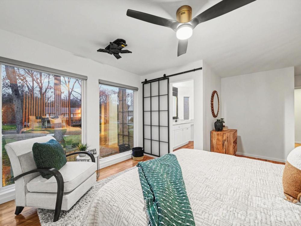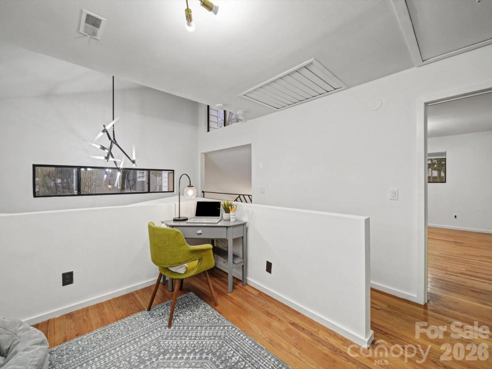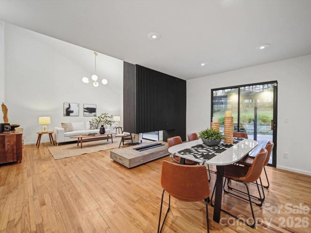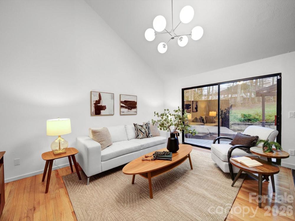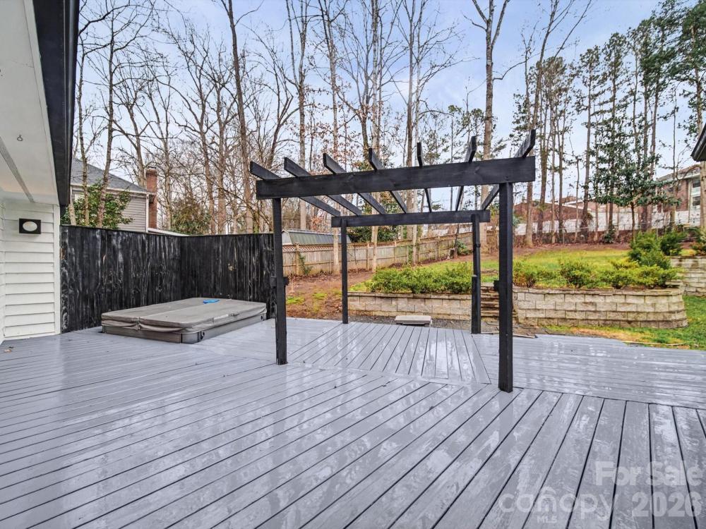Striking contemporary home in a quiet South Charlotte neighborhood, designed for effortless indoor-outdoor living and exceptional entertaining. This 3BR/2.5BA home offers soaring vaulted ceilings, two main-level living areas, plus an upstairs loft ideal for an office or study. Expansive sliding glass doors open from the family room, living room, and dining room to an incredible outdoor oasis featuring a covered porch with TV and speakers, freshly painted oversized deck, pergola, private fenced backyard, and hot tub—all set on a rare 0.59-acre lot. The updated kitchen showcases black-and-white cabinetry, quartz countertops and backsplash, stainless steel appliances, island, and seamless flow to the breakfast area family room and outdoor spaces. Design highlights include hardwood floors throughout, updated lighting, wet bar, wood-slat TV wall, and Opti-Myst Pro vapor fireplace. The primary suite is a true retreat with custom wardrobe wall, motorized blinds, drop-down TV, and spa-like bath with custom tile shower and granite vanity. EV charging station, refrigerator, washer and dryer included. Recent updates include ductwork, roof (2020), and HVAC replacements. Located near sought-after South Charlotte schools.
