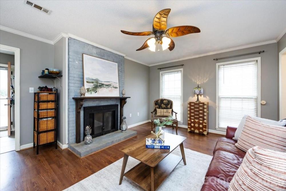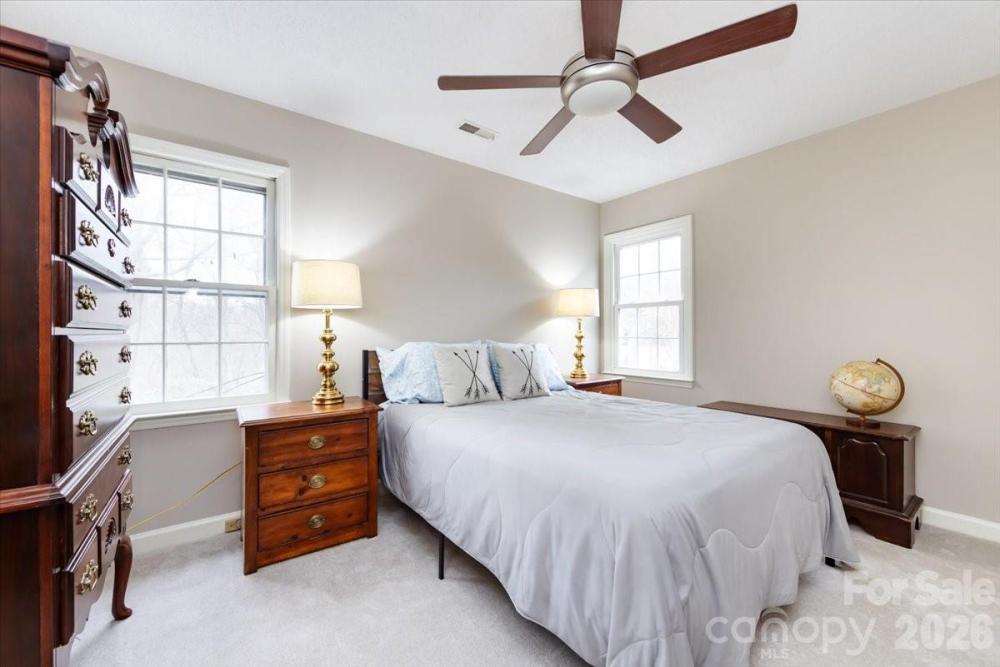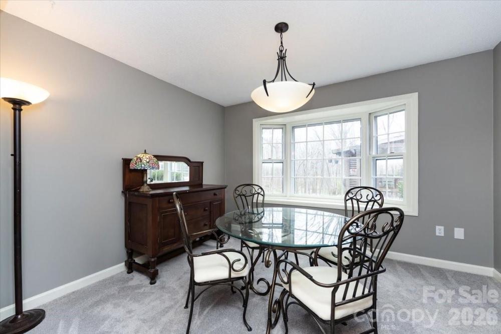 Welcome home to this charming Colonial tucked away in popular Carmel Station. Located on a quiet cul-de-sac street with a fantastic private rear yard nestled among the trees. Enjoy a traditional layout with formal living and dining rooms and a den. Head towards the rear to find an open galley style kitchen with painted white cabinets and granite countertops. An adjacent breakfast area leads to a spacious year-round sunroom. Convenient laundry room and half bath area also found on the main level. Head upstairs to find the primary suite with two walk-in closets and adjacent ensuite with private shower. Two additional bedrooms share a full hall bath with tub/shower combo. One of the best features includes the rear outdoor area with multiple gathering areas overlooking an expansive tree lined and fenced backyard that allow you to enjoy endless days outdoors. Bonus oversized two car garage and a brand new roof. Carmel Station is centrally located so that all the benefits of SouthPark and Ballantyne are easily accessed.