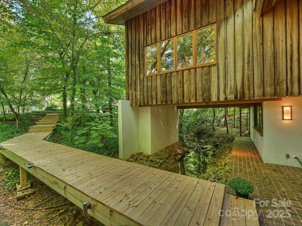 Featured on the Charlotte Museum of History's "Mad About Modern Home Tour" on November 8th, 2025 ... this is a "one-of-a-kind" property ... literally. Built in 1969 and designed by renowned architect, W. Crutcher Ross, this contemporary beauty must be seen up-close to appreciate. Partially built over a creek and nestled among mature trees and landscaping on an almost acre-sized lot (.92), this home truly folds indoor living into the natural world outside. Exterior is weathered Cypress and white stucco, and the Pella windows throughout the home create an organic warmth and unparalleled connection to nature. Rear yard includes fenced garden with raised beds, a large, flat greenspace, as well as private access to the Greenway and a short walk to Park Road Park. Lower-level entry features a gorgeous, brick foyer with "floating stairs" to the main level, a library/office/flexspace with 1/2 bath, plus ample storage. Main level offers hardwood flooring and boasts a primary en-suite, with two additional bedrooms that share a full bath. Stunning Great Room with stone fireplace and vaulted ceiling anchors the interior living areas/kitchen, and transitions effortlessly into sunroom/dining areas and outside via side deck. Custom wine cellar, multiple outdoor spaces, and too many custom features to mention (see list in attachments)! Pea-gravel circular drive at street as well as separate drive across bridge that leads to additional rear parking and two-car garage. Only a 15-20 min drive to airport/uptown and walking distance to Southpark, yet it feels like the NC mountains living here in this unique setting.